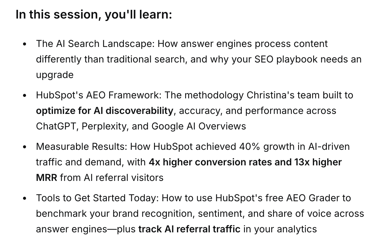 Join Christina Clark, Head of Product Growth at HubSpot, to learn the proven strategies her team used to increase AI referral traffic and demand by 40% through Answer Engine Optimization (AEO). Christina will share the frameworks, tools, and tactical approaches that helped HubSpot pioneer AEO, and how you can apply these same principles to drive qualified conversions in the AI-powered search era.