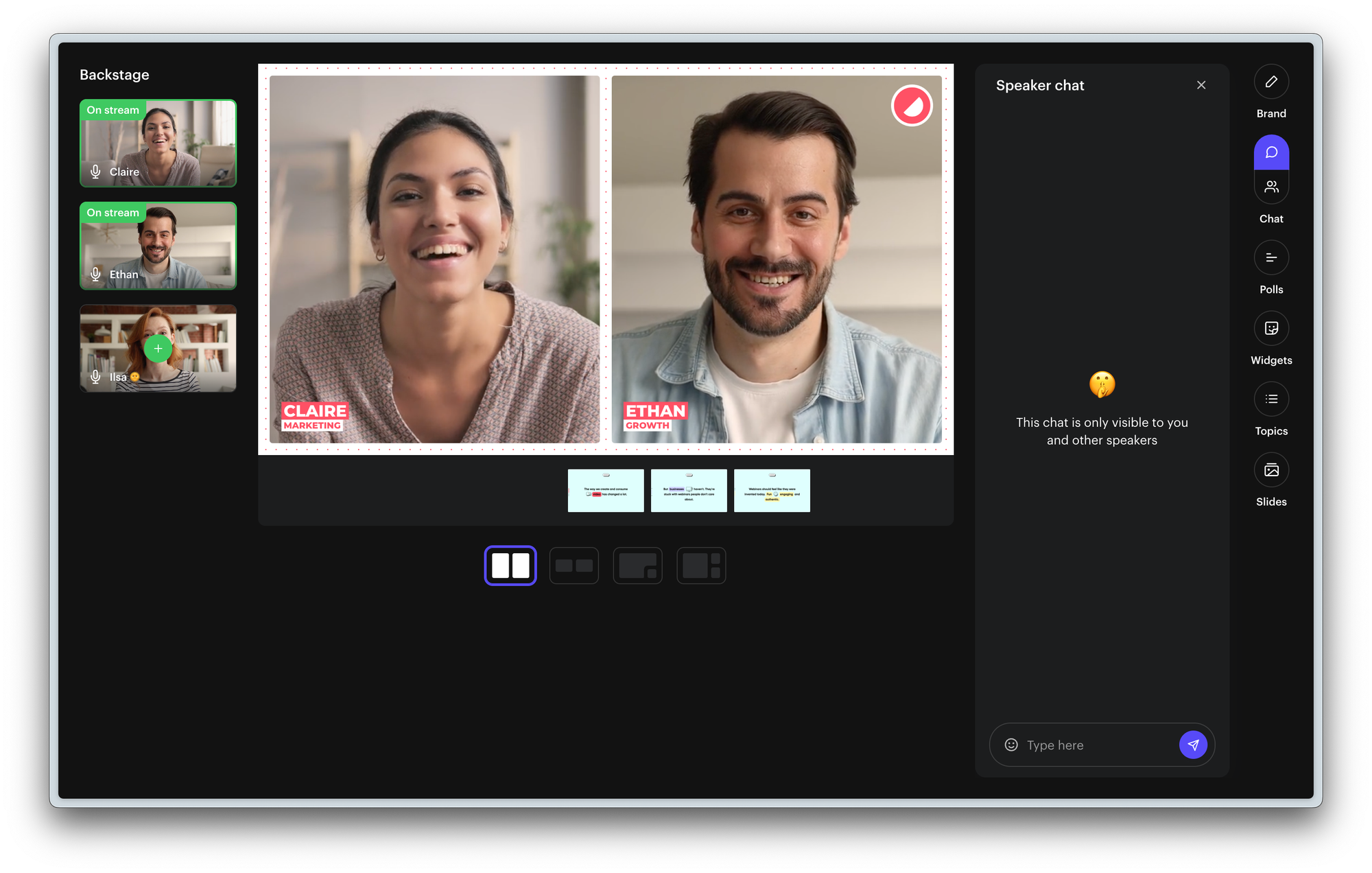 If the organizer agrees, we recommend to interact with the audience. This way you'll build a more personal connection with the audience. Acknowledge their chat messages or react to them. The best speakers do this while they're live – and create a conversation that way. Good luck!