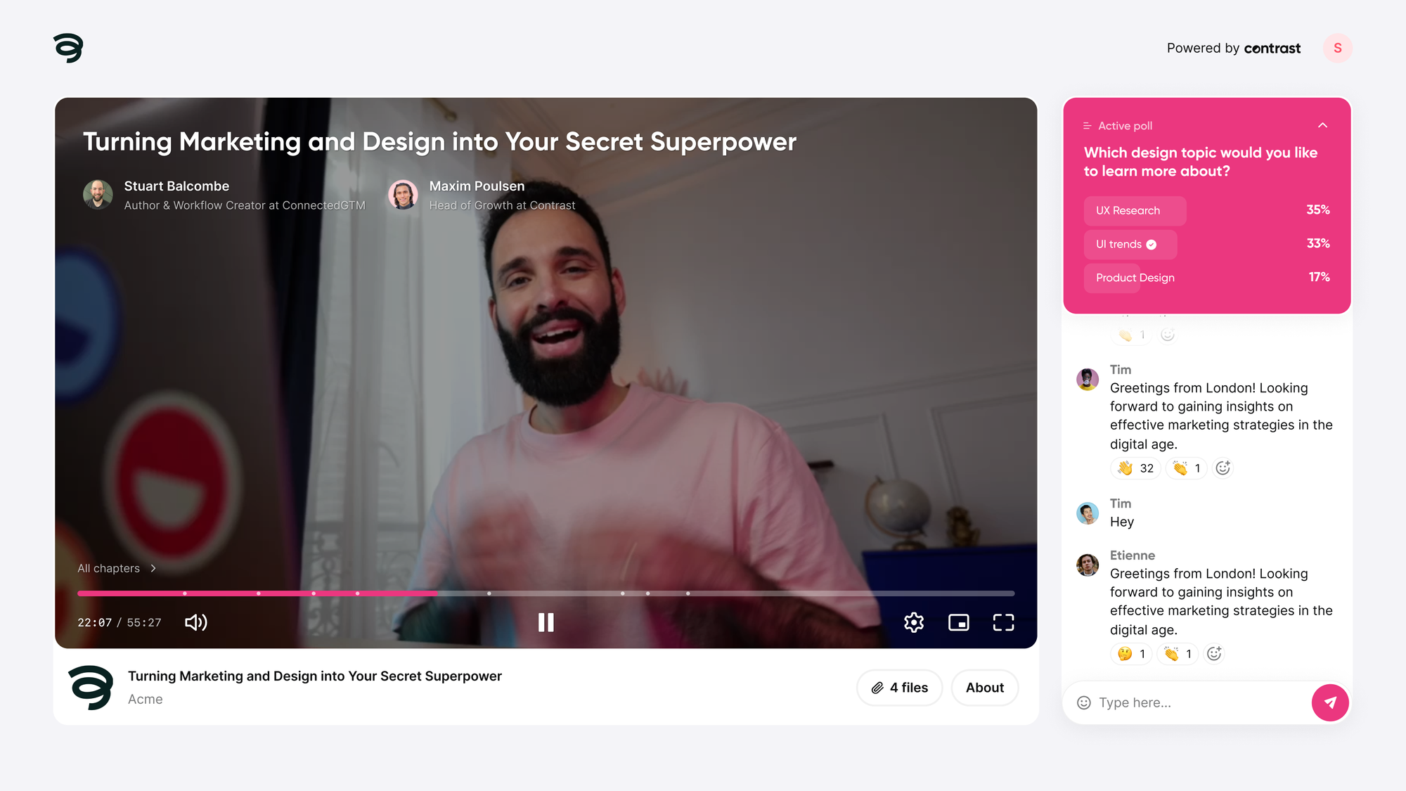Webinar tools like Contrast make it super duper easy to do that. Select a bit of text from the transcript to create the clip. Double check the subtitles. Choose your color. Download. Share. Done. 1000 likes.