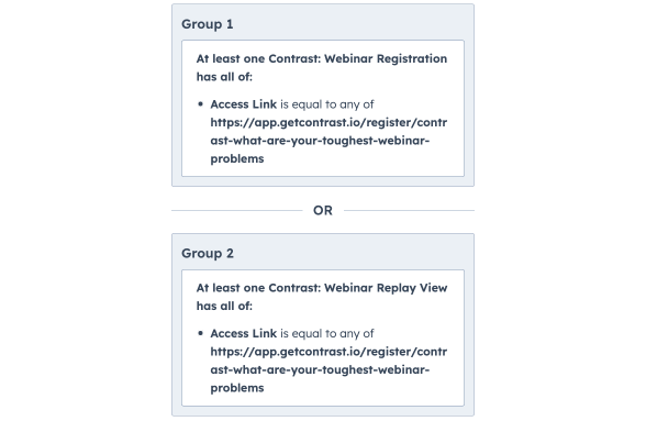 Webinars are a great medium to find the most interested leads and be able to route them to your sales team for outreach. There are many ways to use Contrast data in HubSpot to do this: