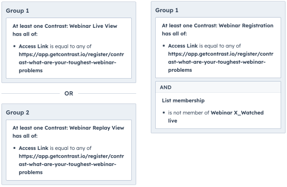 ⚠️ We only send “Registration” Timeline events when the webinar is upcoming, and not for replay views. If you want to create a list of everyone that watched the live OR replay, you need to use a second condition and an “OR”.