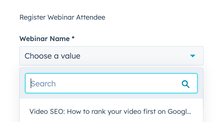 Once you have selected this action you can select the webinar from the dropdown list (you might have to search if you have multiple webinars created in Contrast):