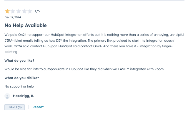 ON24's HubSpot Marketplace rating is notably lower than its G2 score. Users in the marketplace cite setup complexity and insufficient support as the main issues. The gap between the two ratings suggests the integration works better for teams with dedicated technical resources than for those attempting self-service setup.