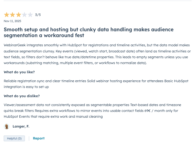The WebinarGeek HubSpot integration connects natively and syncs registrations, live and replay viewing data, poll responses, CTA clicks, Q&A activity, and watch time as timeline events. Custom registration fields are only available as timeline properties, meaning they cannot trigger workflows or be used for contact segmentation. UTM and source tracking do not flow back to HubSpot, which limits attribution reporting for teams tracking lead sources across campaigns.
